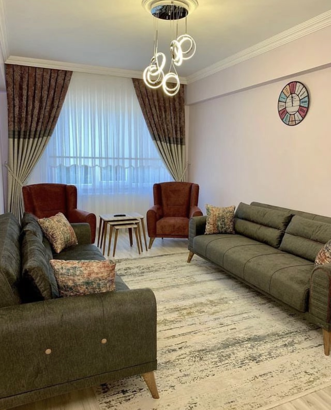 • كرسيان مغريان: بجوار الكنب، ستجد كرسيين مغريين بمقاس 85 سم، تم تصميمهما لتوفير مقاعد فردية مريحة وجذابة.